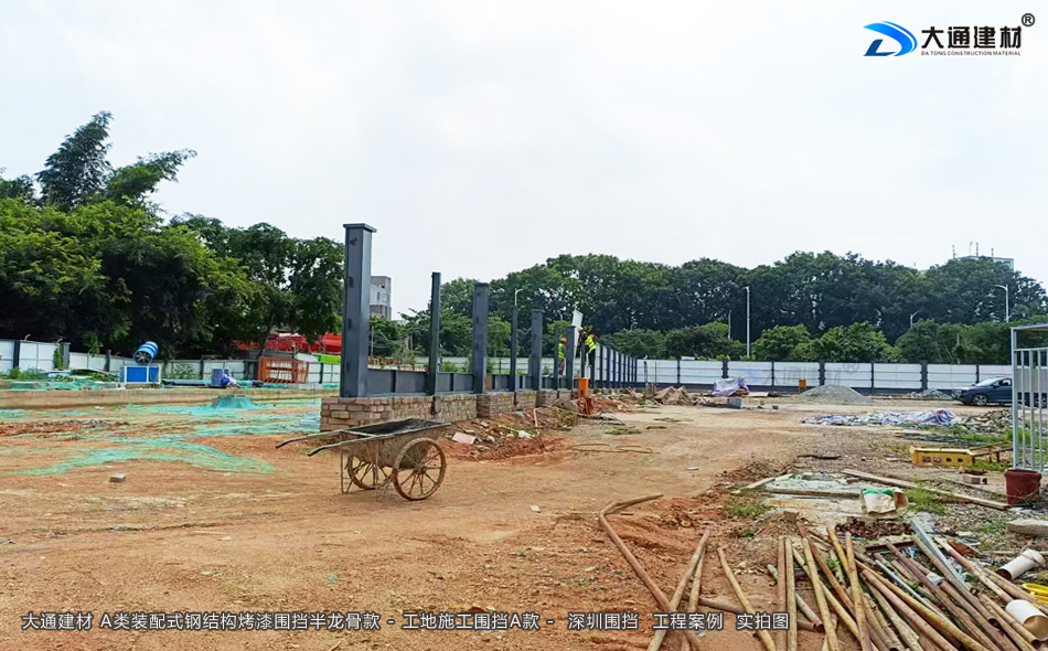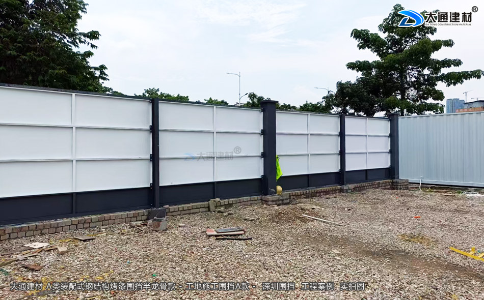 深圳大通建材A類裝配式鋼結構烤漆圍擋,主要由型鋼、方管、鋼板等鋼材構建框架,搭配鋼板等面板組成,即采用裝配式設計的特點,方便根據場地實際需求進行靈活組裝與拆卸,能多次重復使用,有效降低了工程成本,符合可持續發展的理念。