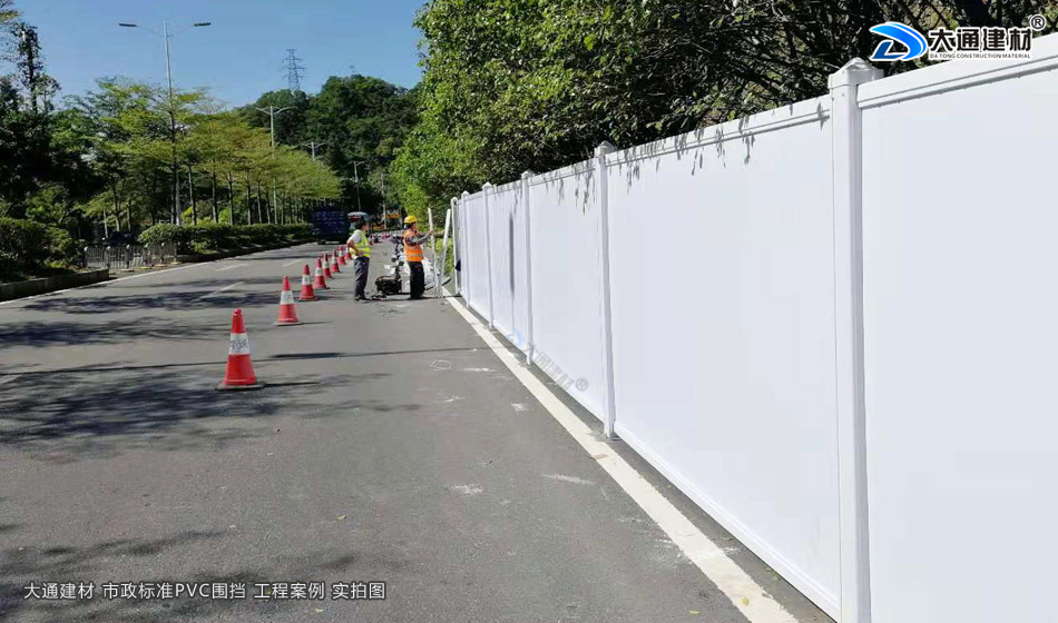 大通建材市政工程PVC圍擋的圍墻板采用白色PVC長條版拼接,而立柱、橫管均為白色PVC材料,內部均襯塑鋼方通,立柱底板為鋼板,機動靈活,快速拆裝,簡單快捷牢固,經濟實用、成本低; 并加斜支撐,增加受力,承載力大、抗風阻系數高、穩定性強。非常適用于市政建設施工、房地產項目施工、高架橋施工、地地鐵項目施工、路橋維護施工、隧道施工、立面改造施工、廠房隔斷施工等工程。