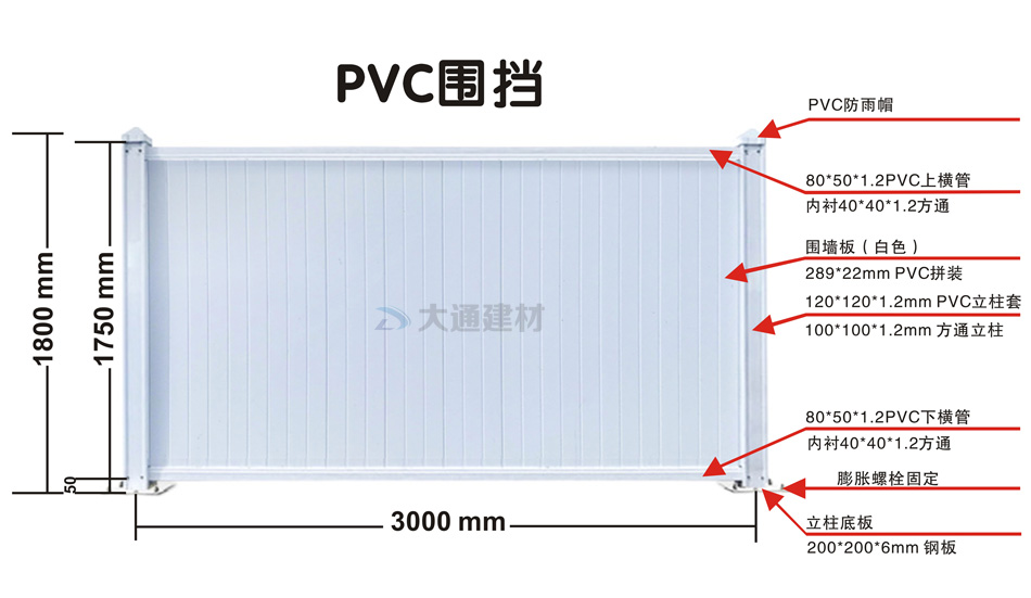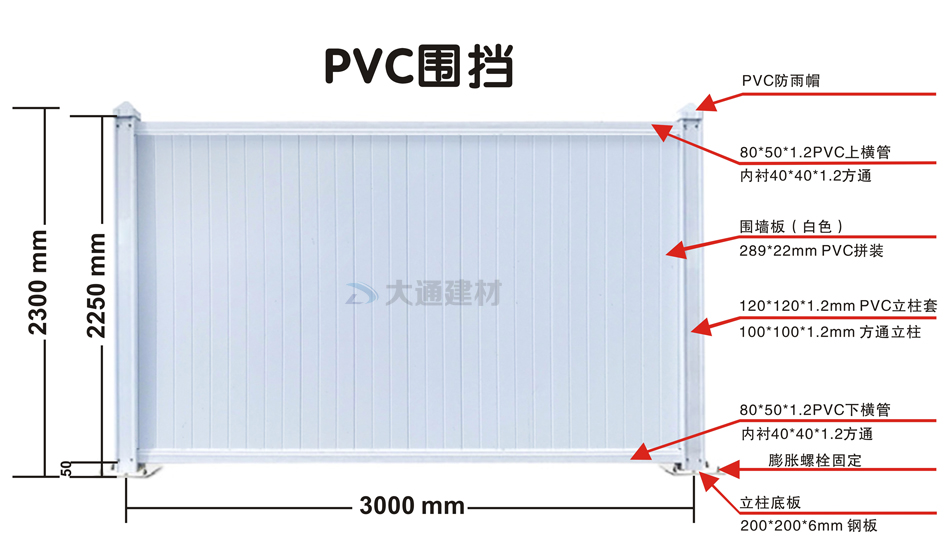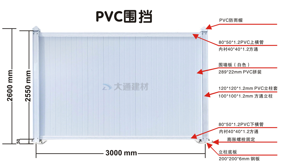 深圳市大通建材白色PVC圍擋的規(guī)格尺寸文字描述: