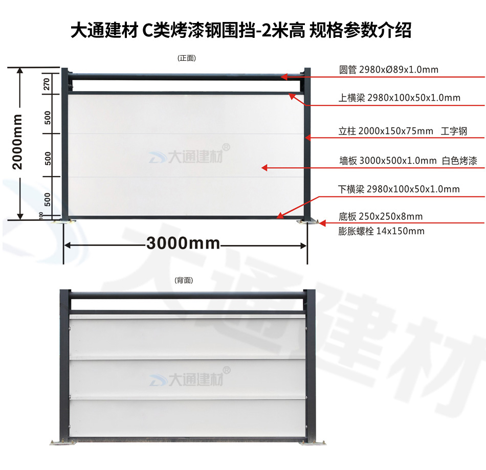 大通建材 C類裝配式鋼圍擋-烤漆款的烤漆鋼板厚度是1.0mm,采用150*75mm工字鋼深灰色烤漆立柱,同時每一擋圍擋的長度是3m,高度是2.5m,其它具體參數(shù)規(guī)格請參照上述展示的圍擋參數(shù)圖。